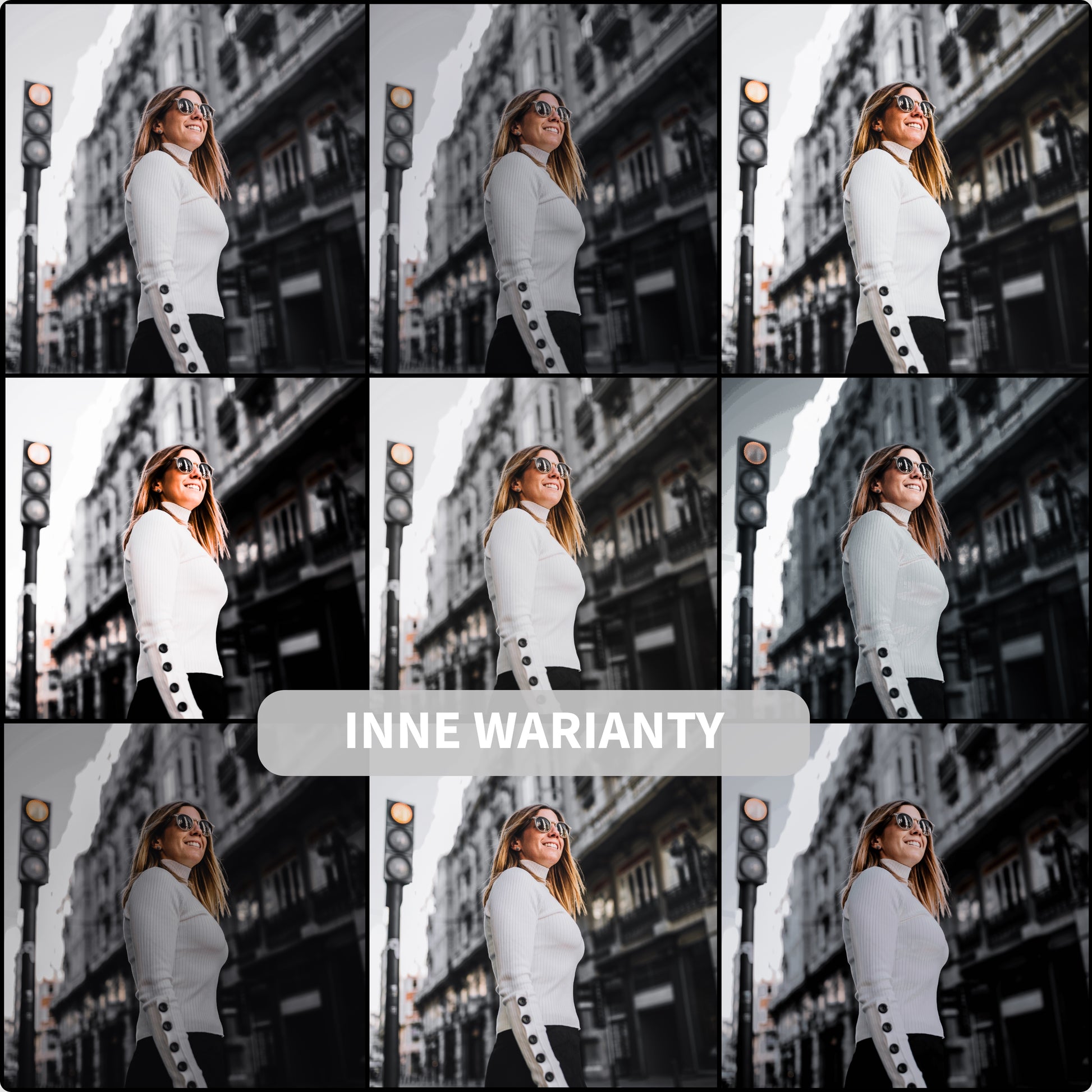 Preset Blvck Paris podkreśla głębokie czerń i szarości, nadając kontrastom wyrazistość, jednocześnie zachowując detale w cieniach i światłach. Drobny filmowy grain dodaje autentyczności i artystycznego charakteru, tworząc efekt luksusowej, miejskiej fotografii. Dzięki różnym wersjom presetów w pakiecie możesz dopasować styl do różnych scen i warunków oświetleniowych, eksperymentując z ekspozycją i nasyceniem barw.