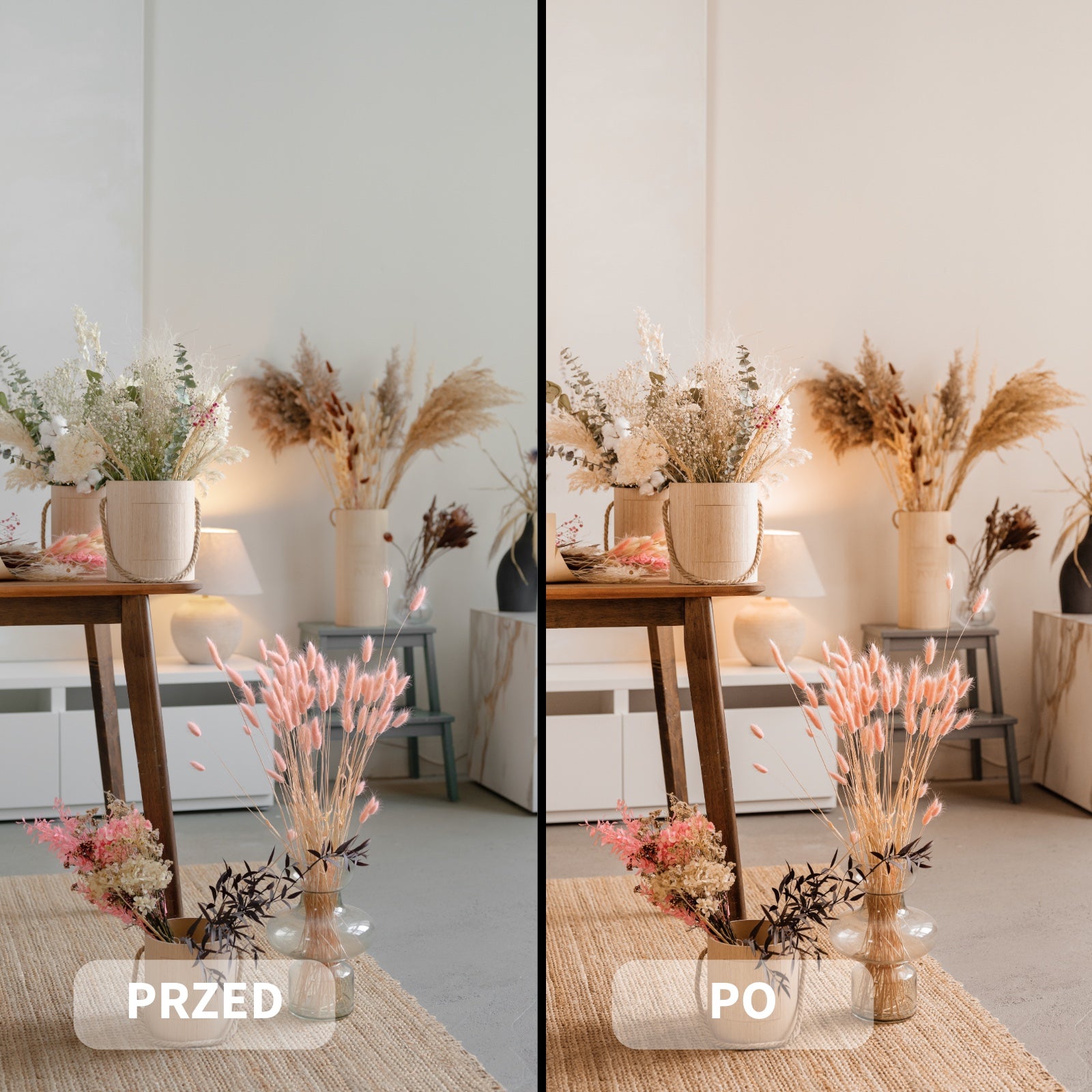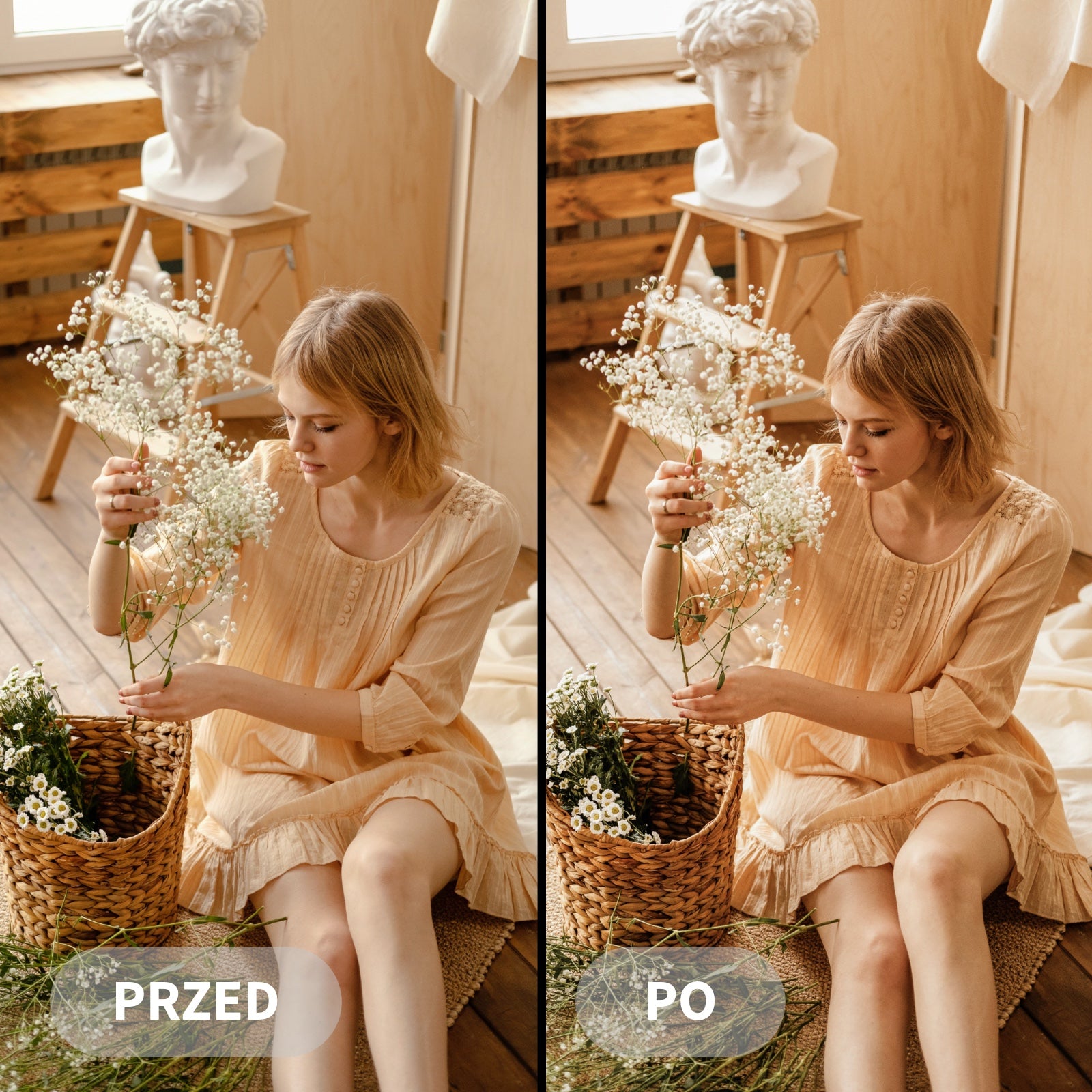 Preset Boho Dream podkreśla ciepłe, pastelowe tony, miękkie światło i naturalne kontrasty, nadając zdjęciom przytulną, eteryczną estetykę.