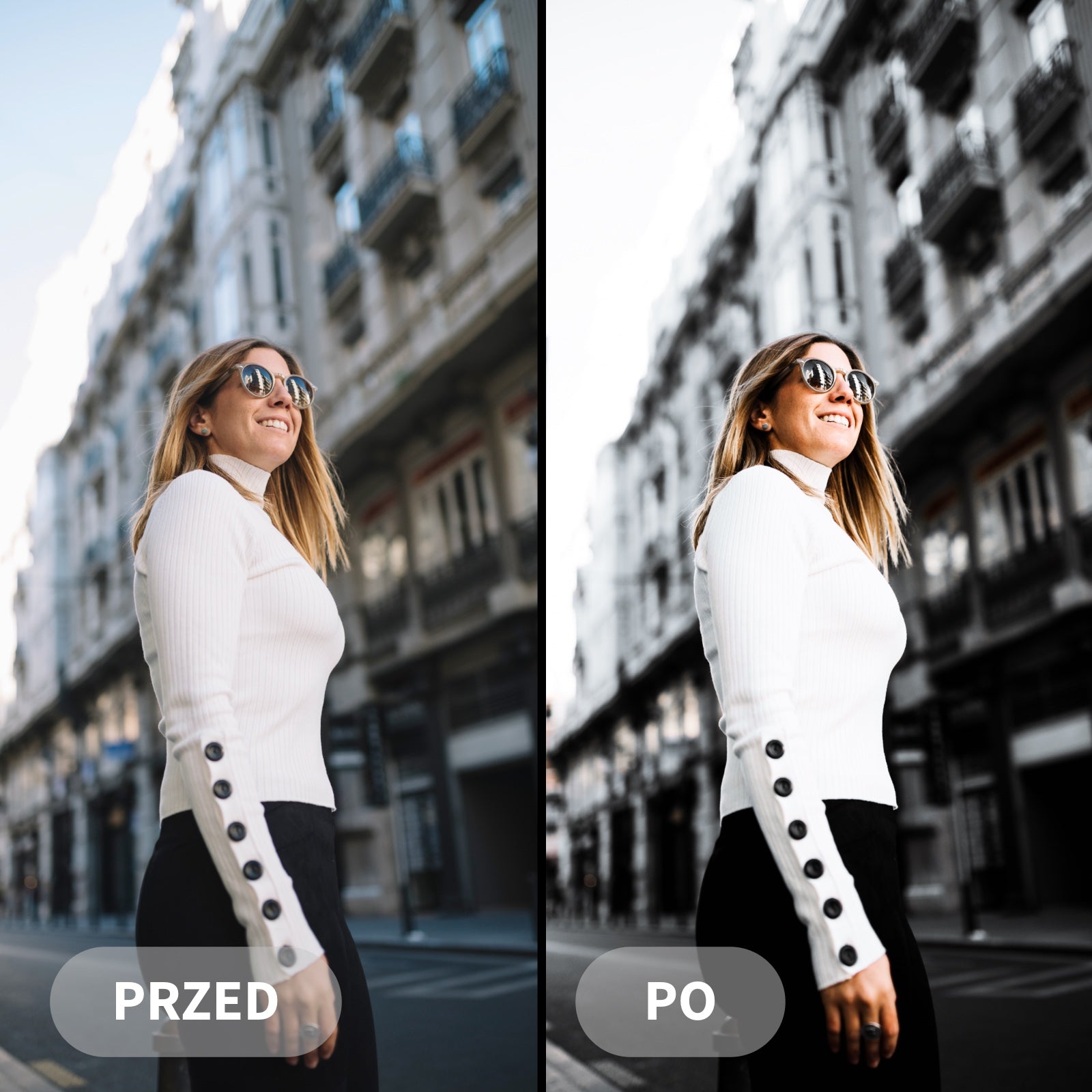 Idealny do zdjęć z podróży, spacerów po mieście, kawiarnianych kadrów, architektury oraz portretów na tle miejskiej scenerii. Dodaje lekko „rozmytą” atmosferę, wygładza odcienie skóry i ociepla światło – dzięki czemu każde zdjęcie wygląda bardziej artystycznie i klimatycznie.