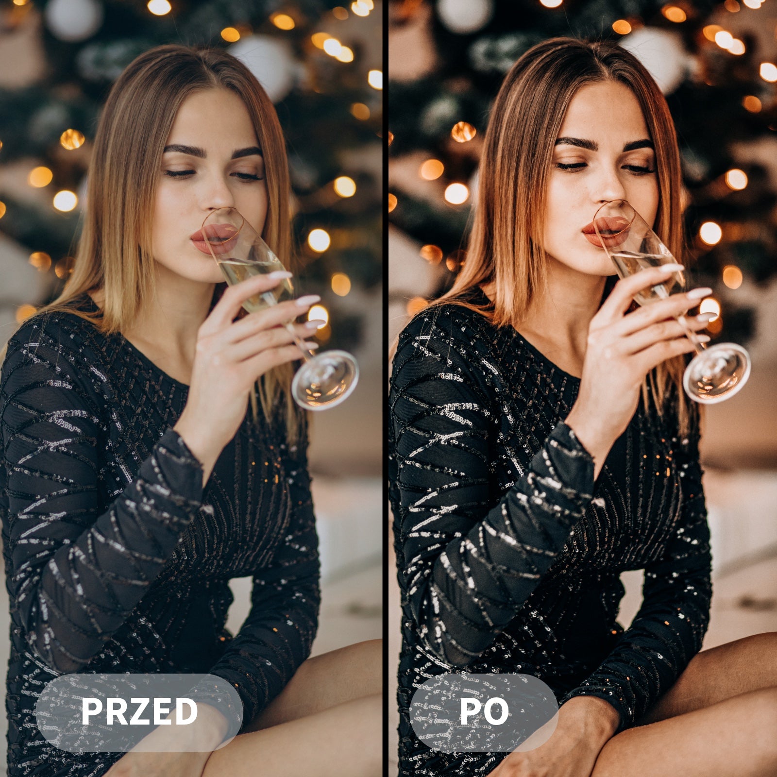 Preset Rustic Christmas podbija ciepłe, złote i czerwone tony, delikatnie przyciemnia kadry i wzmacnia kontrast, tworząc przytulną, nastrojową atmosferę.