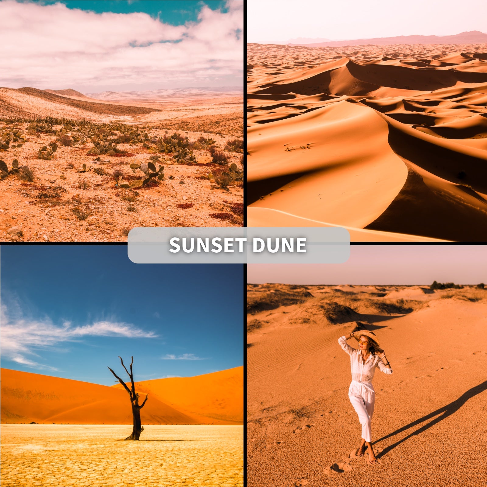 Preset Sunset Dune do Lightroom to pakiet 10 presetów, które nadają zdjęciom ciepły, romantyczny i pustynny charakter. Idealny do fotografii krajobrazów, podróży, portretów i estetycznych ujęć w plenerze, gdzie chcesz uchwycić magię zachodu słońca i piaskowych tonów.