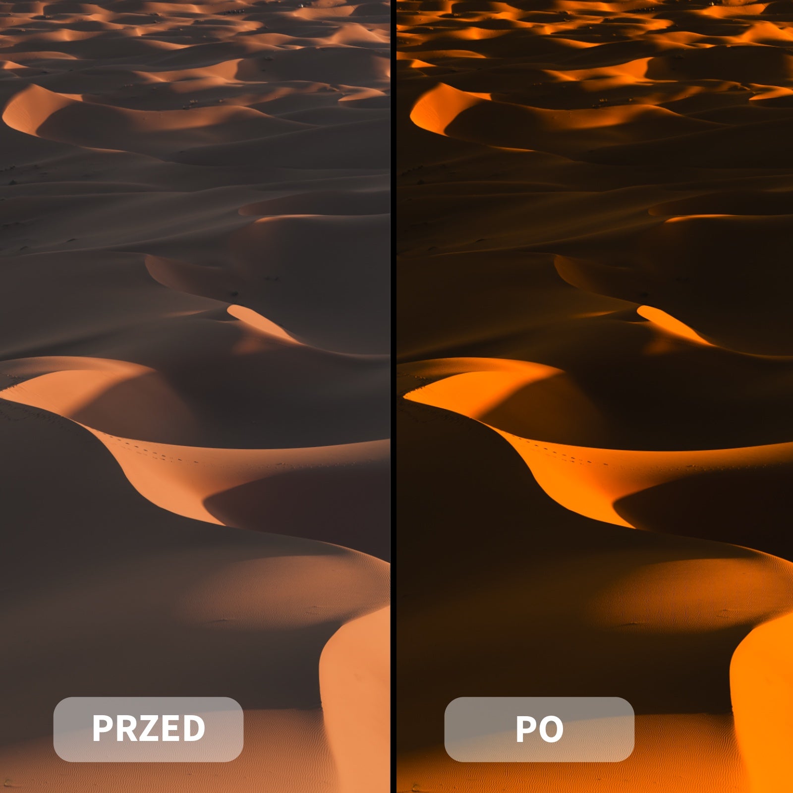 Preset Sunset Dune podkreśla złote, pomarańczowe i brązowe odcienie, delikatnie przyciemnia kadry i wzmacnia kontrast, nadając zdjęciom głębię i nastrojowy klimat.